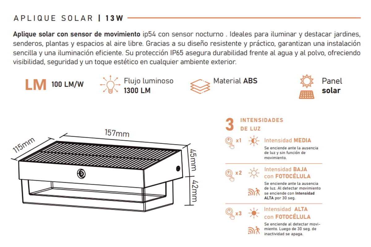 Aplique solar para pared ideal para iluminar exteriores con un diseño moderno y funcional. Emite luz cálida, perfecta para crear ambientes agradables sin perder seguridad. Funciona con energía solar, incorporando sensor de movimiento para encenderse automáticamente y aumentar la intensidad cuando detecta presencia.