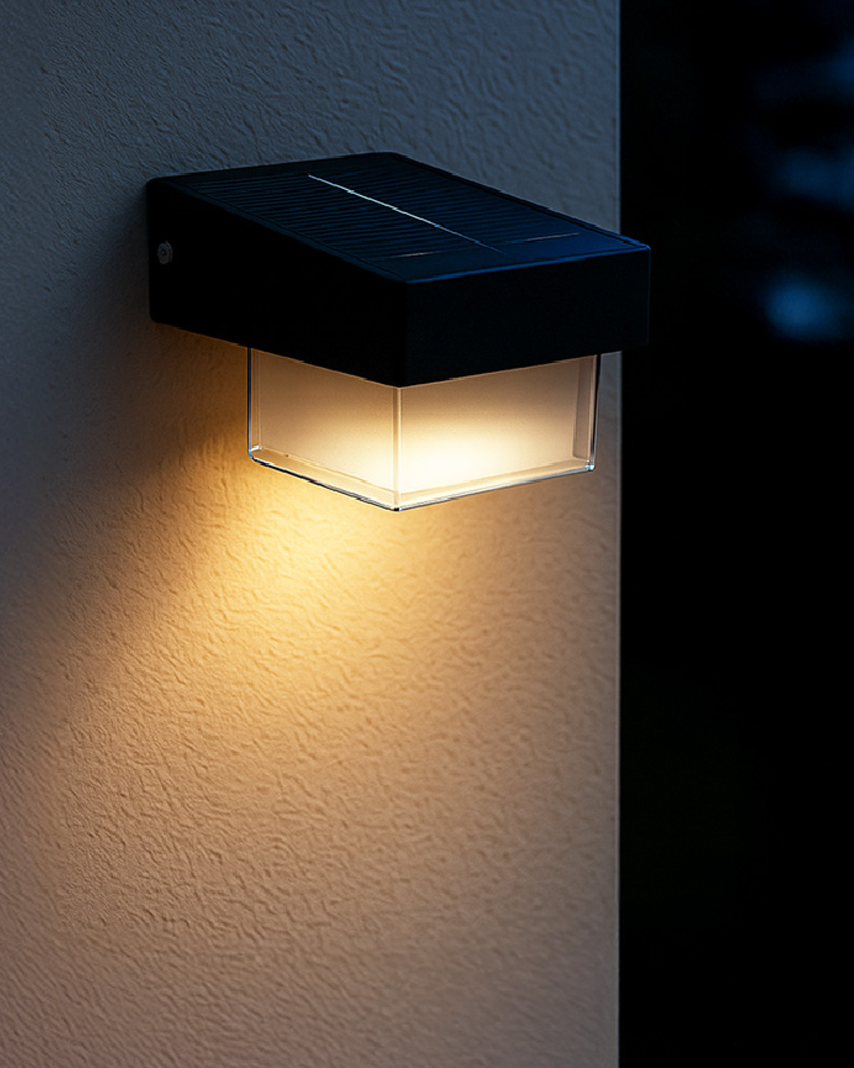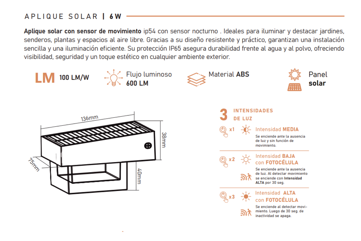Aplique solar para pared compacto y eficiente, ideal para iluminar exteriores con luz cálida y generar un ambiente agradable. Funciona con energía solar, evitando consumo eléctrico, y cuenta con sensor de movimiento que activa y refuerza la iluminación al detectar presencia.